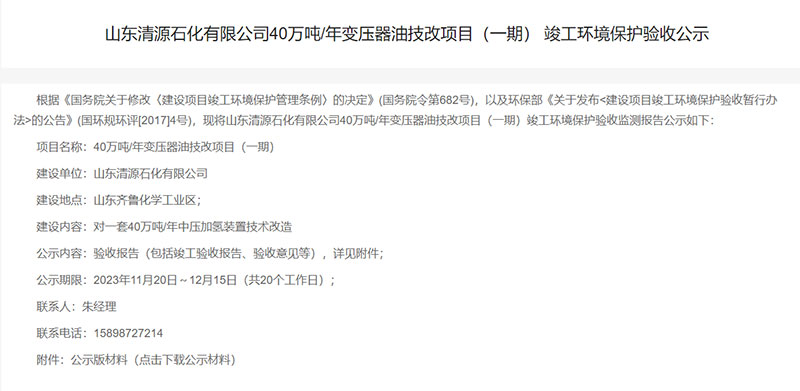 山東清源石化有限公司40萬(wàn)噸/年變壓器油技改項(xiàng)目(一期)竣工環(huán)境保護(hù)驗(yàn)收公示